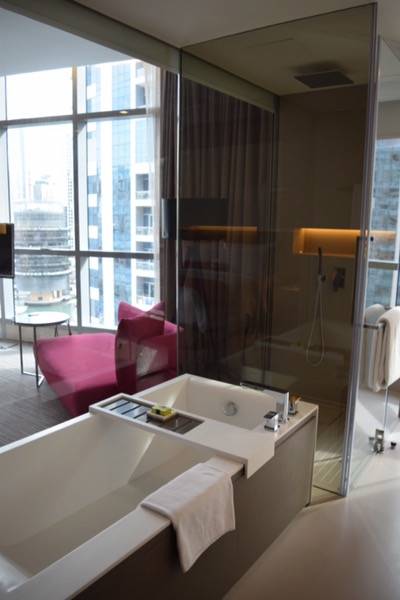 The hotel´s 328 rooms and suites are (I assume) very modern with fair furniture and a lot of glass. The bathroom was separated from the room by a glass wall. But no worries – for more privacy, you can always close the blinds. This allowed me to tick another thing off my bucket list: watching TV while taking a bath 🙂 The older I get, the more I appreciate nice views, and the view from my room was stunning. This view explains why I love Dubai Marina so much.
